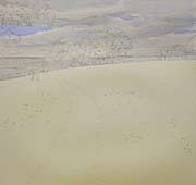 Beginning with the sky, I wanted to create breaking clouds with some light shining through from the west. I chose to use cobalt and burnt sienna to create the grey clouds and used the technique of letting the colors flow without the help of a brush to get those interlocking colors that can not be duplicated by any other medium.