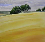 The background is put into place creating the illusion of depth by greying down the trees and hills and reducing the amount of detail. A light wash of naples and raw sienna was used for the light wash for the forground.